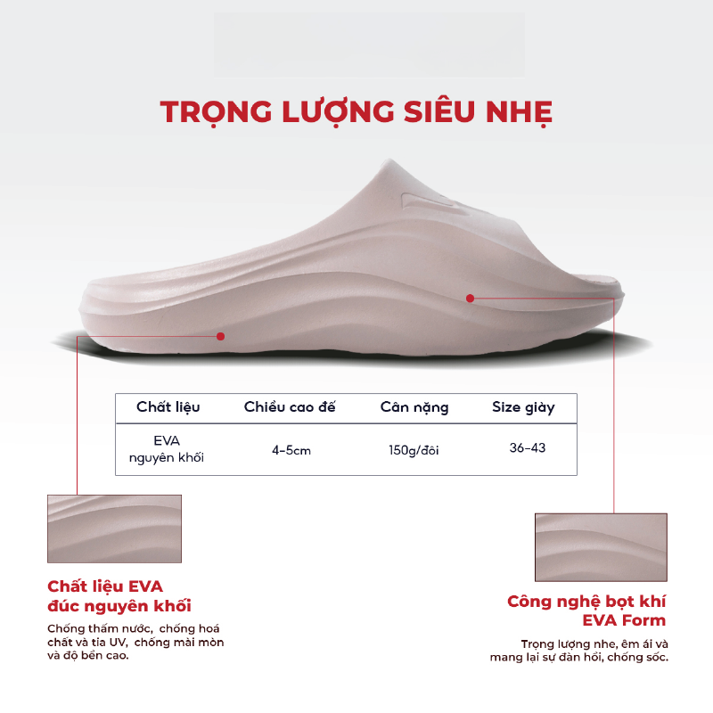Sản phẩm được làm từ chất liệu lành tính với da, an toàn. Chất liệu đối với sản phẩm da giày là chất liệu microfiber tiệm cận da thật. Sản phẩm về dép, sục nguyên khối là chất liệu EVA cao cấp, có độ bền cao